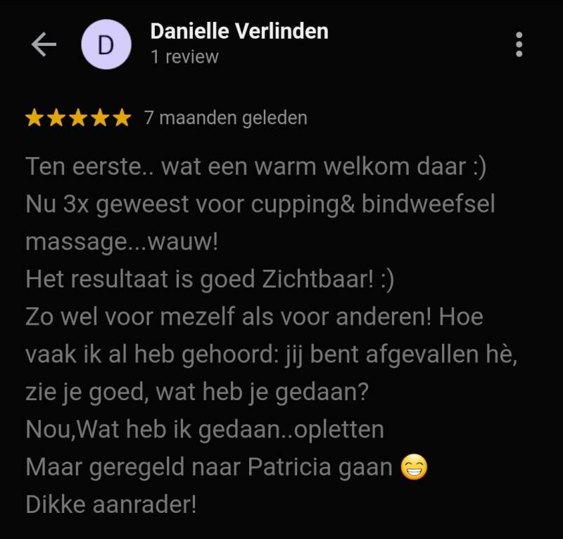 "Al langere tijd liep ik met rug- en nekklachten (o.a. een rughernia) rond en heb ik diverse behandelingen gehad. De hernia is genezen, maar ik had nog allerlei rest klachten. De behandelingen elders (en ik heb er veel gehad) waren allemaal maar een stukje van de oplossing. Patricia zorgt er nu met haar massages voor dat de klachten in mijn rug en nek al zo veel minder zijn. Ik heb nog een aantal behandelingen te gaan, maar ik realiseer me nu pas hoe beperkt ik was in sommige bewegingen vanuit mijn rug/nek. En hoe fijn het is dat dit nu opgelost is (of nog opgelost wordt de komende behandelingen)! Daarnaast is Patricia een heel prettig persoon. Ze stelt je op je gemak, is betrokken en eerlijk en ze heeft gewoon gouden handen! Erg blij dat ik bij haar terecht gekomen ben!"